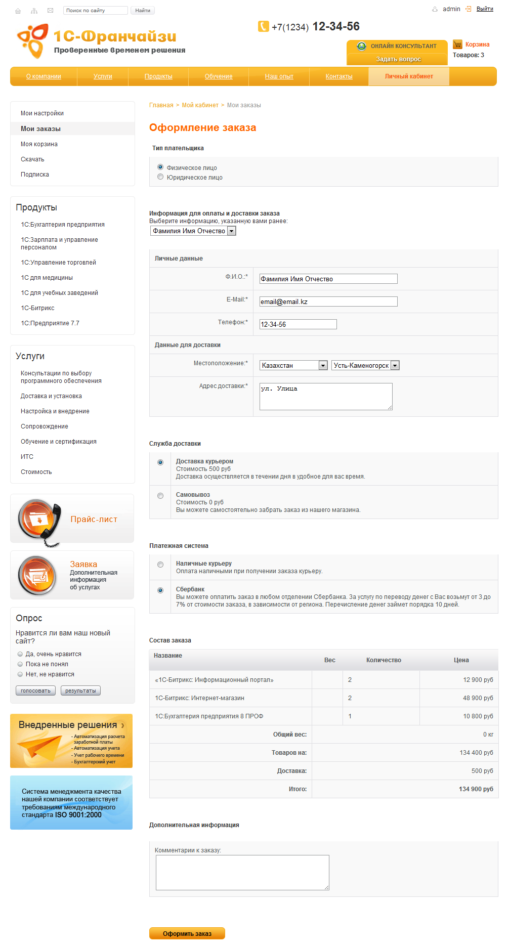 На примере функционала стандартной поставки «1С-Битрикс: Интернет-магазин 1С:Франчайзи» процесс покупки для зарегистрированного пользователя выглядит следующим образом (стандартный процесс покупки может быть изменен под индивидуальные условия работы интернет-магазина):