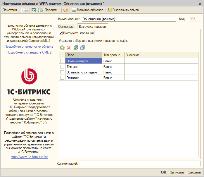 Каталог товаров и услуг интернет-магазина может быть отражен в конфигурации «1С:Предприятие». Для настройки двустороннего обмена между «1С-Битрикс: Управление сайтом» и конфигурацией «1С:Предприятие» (для торговых конфигураций) уже разработан набор штатных процедур. От пользователя требуется только указать необходимые параметры настройки для организации обмена.