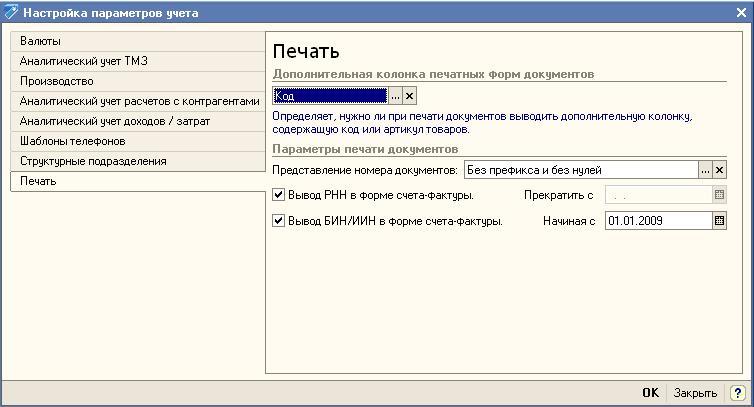 Обратите внимание, что в статье 263 указывается перечень необходимых реквизитов, но не запрещается наличия в счете-фактуре дополнительных данных. Поскольку в августе 2010 года возникнет необходимость указания в отчетности (в том числе в формах 300.07 и 300.08) информации о БИН/ИИН покупателей и поставщиков, то кажется важным своевременно предоставить клиентам информацию о собственном БИН/ИНН и собрать в свою очередь сведения об идентификационных номерах контрагентов предприятия. С этой целью возможно начать ввод в счетах-фактурах информации об идентификационных номерах совместно с информацией о РНН. В версии 1.5.14 1С:Бухгалтерии для Казахстана появилась возможность опционального вывода в счетах-фактурах информации о РНН и БИН. В форме настройки параметров печати (меню Предприятие-Настройка вкладка Печать) можно отметить необходимые реквизиты и указать дату: