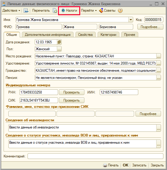 При наличии у работника справки об инвалидности I, II, III групп для предоставления льготы при расчете ИПН в карточке физического лица в графе «Сведения об инвалидности» необходимо заполнить серию справки, номер справки, дату выдачи, группу инвалидности, срок действия справки, инвалидность.