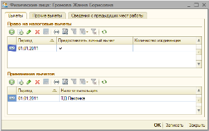 на закладке «Вычеты» необходимо указать право на налоговые вычеты (период, с которого будет действовать вычет по ИПН, и признак предоставления вычета) и заполнить табличную часть «Применение вычетов» (значения «период» и «налогоплательщик»).