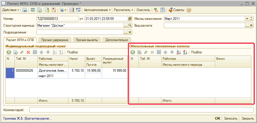 Тогда при заполнении документа «Расчет ИПН, ОПВ и удержаний» при расчете ИПН работнику будет предоставлен вычет в размере 1 МЗП.