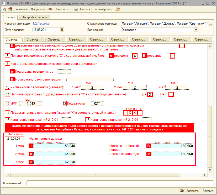 Тогда данные по начисленным доходам и рассчитанным налогам с заработной платы будут отражены в форме 210.00 в соответствующих строках. Так, например, начисленные доходы будут отражены в строке 210.00.001 в разделе «Исчисление ИПН с доходов иностранцев и лиц без гражданства, являющихся резидентами РК в соответствии с 167, 202 НК РК» формы 210.00.