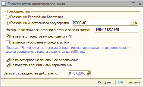 Чтобы настроить учет ИПН для работников-граждан других государств, но при этом имеющих вид на жительство в РК, в карточке физического лица в графе «Гражданство» нужно установить признак «Гражданин иностранного государства», выбрать страну из «Классификатора стран мира», указать номер налоговой регистрации в стране резидентства (при его наличии).