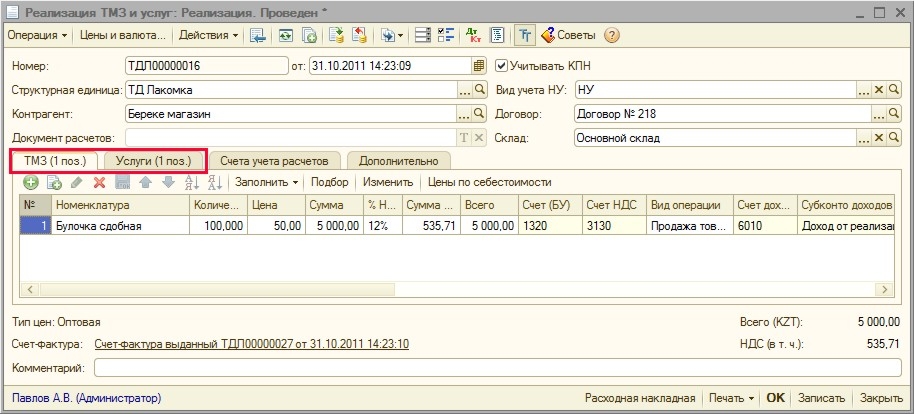 Документ «Реализация ТМЗ и услуг» служит для отражения операций по реализации товарно-материальных запасов и услуг.