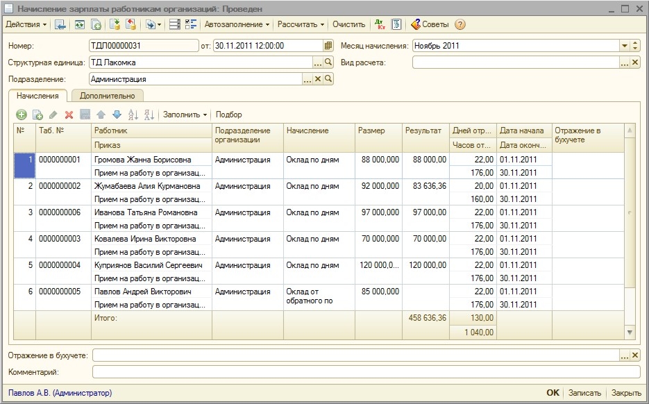 Документ «Кадровое перемещение» служит для отражения повышения тарифных ставок работников, перемещения между подразделениями и смены должности.