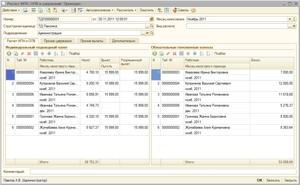 - как ввести информацию о вычетах по сотруднику для расчета ИПН и так далее.