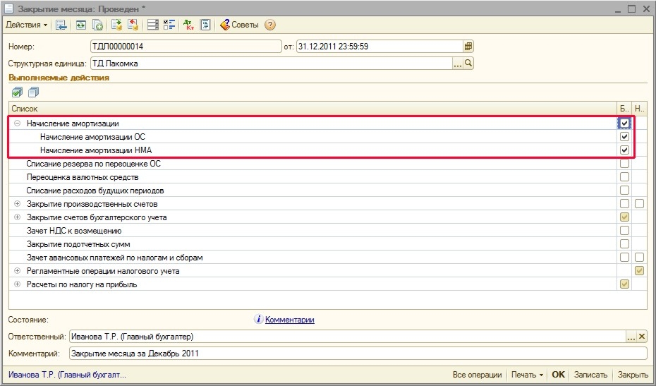Начисление амортизации по основным средствам проводится регламентной операцией Закрытие месяца. При проведении документа с установленным флажком «Начисление амортизации ОС» будет рассчитана амортизация указанных активов.