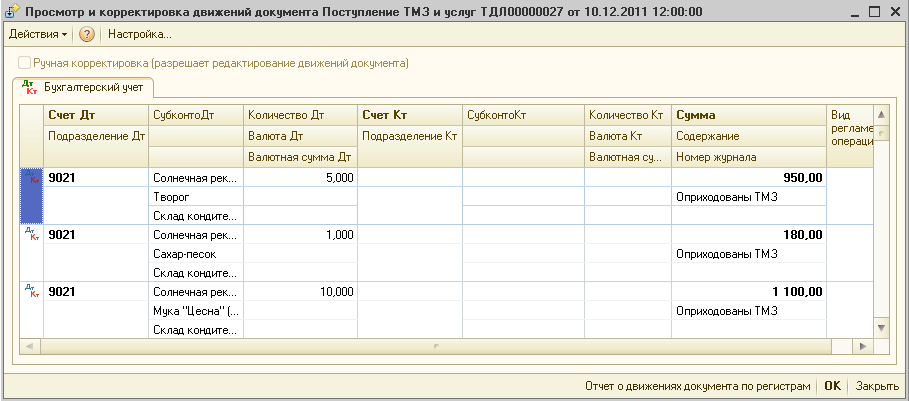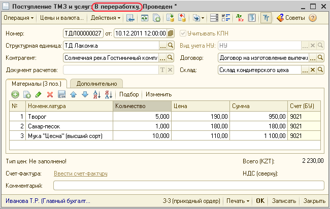 Поступившие на переработку материалы отражаются на забалансовом счете 9021 «Материалы на складе» по залоговым ценам, указываемым в табличной части документа.