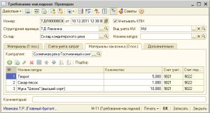 Шаг 2: Для передачи материалов в производство предназначен документ «Требование-накладная» (меню Производство – Требование-накладная). Данный документ можно создать на основании документа «Поступление ТМЗ и услуг» с видом операции «В переработку», что позволит произвести автоматическое заполнение табличной части документа.