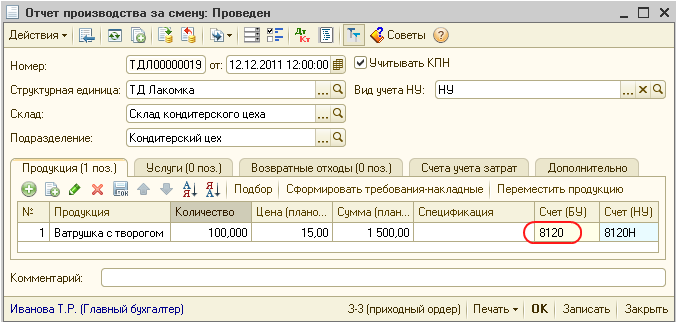Шаг 3: Выпуск продукции из материала заказчика, после того как собраны все затраты, формируется в конфигурации с помощью документа «Отчет производства за смену» (меню Производство – Отчет производства за смену).