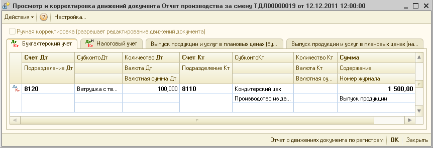 В целях разграничения производственного учета по выпуску продукции из давальческого сырья в документе выбирается счет учета 8120 «Производство из давальческого сырья». В результате проведения документа формируется проводка по выпуску продукции: