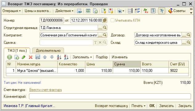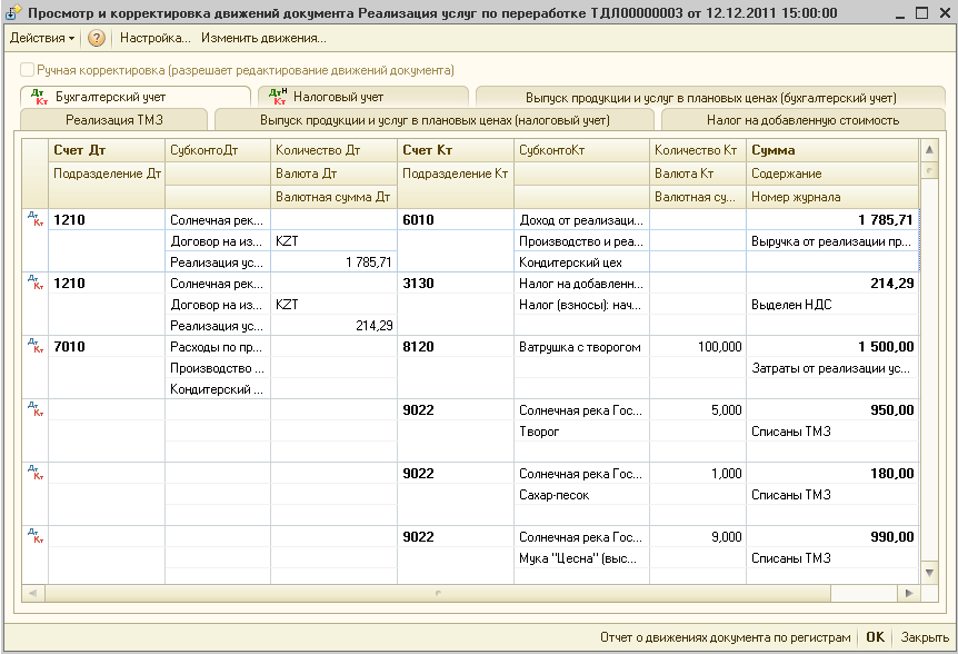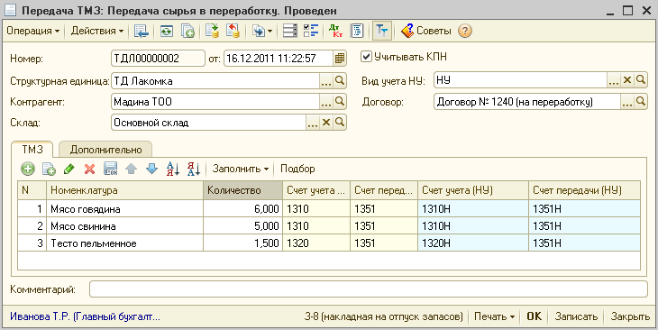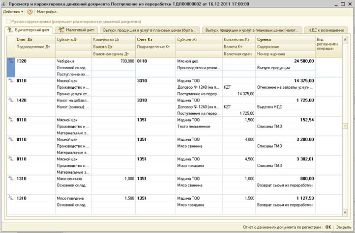 Таким образом, наряду с обычным производственным процессом программа «1С:Бухгалтерия для Казахстана» позволяет отражать операции по учету давальческого сырья как принятого, так и переданного в переработку, а также выпуска из него готовой продукции.