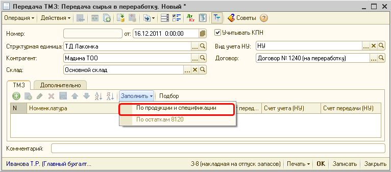 На закладке «Номенклатура» указывается перечень материалов, передаваемых в переработку, которые выбираются из справочника «Номенклатура». Также табличную часть можно заполнить с помощью кнопки «Заполнить», выбрав пункт «По продукции и спецификации». В данном случае табличная часть будет заполнена исходными комплектующими, которые необходимы на изготовление продукции, согласно заполненной спецификации.