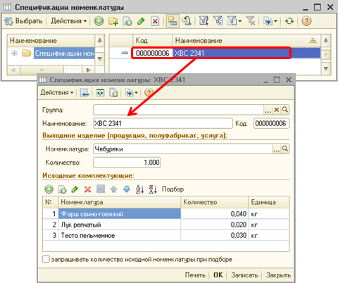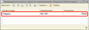 Для автоматического расчета состава сырья необходимо в справочник «Спецификации номенклатуры» добавить элемент, где указать наименование продукции (выход спецификации) и список материалов, необходимых для изготовления указанного выхода.
