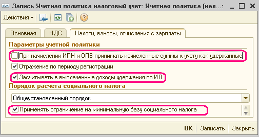 ВАЖНО! При внесении любых изменений в настройки, влияющие на расчет налогов и отчислений, необходимо перепровести все документы по начислению зарплаты, налогов, отчислений и удержаний.