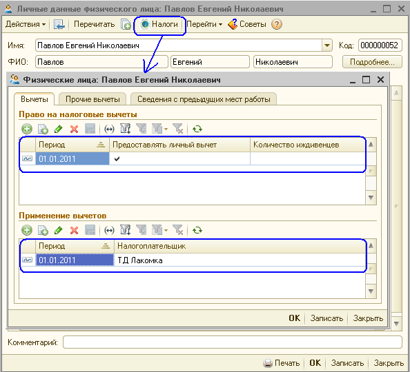 - Установка признака предоставления вычета в размере МЗП выполняется в справочнике «Физические лица», кнопка «Налоги», закладка «Вычеты», если работник подал заявление на применение налогового вычета в размере 1 минимальной заработной платы. На закладке «Вычеты» в табличной части «Право на налоговые вычеты» необходимо установить дату, с которой будет предоставляться вычет. В табличной части «Применение вычетов» указывается дата и организация, в которой предоставляется вычет.