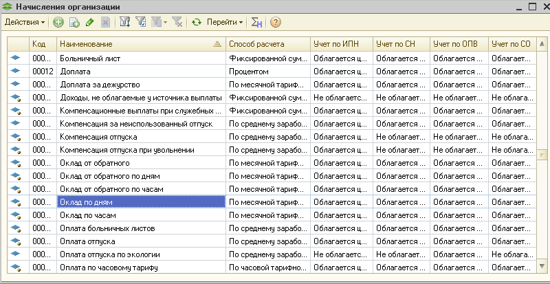 - Настройка налогообложения всех видов начислений производится в плане видов расчета «Начисления организации». Сведения по всем видам начислений, которые предусмотрены в положении об оплате труда, в конфигурации хранятся в плане видов расчета «Основные начисления организации» (меню Зарплата – Настройка начислений – Виды начислений).Содержит список начислений, используемых при расчете заработной платы работников организаций. Список видов начислений может дополняться пользователем по мере необходимости самостоятельно. При этом в нем уже содержатся наиболее часто используемые виды начислений, такие как: "Оклад по дням", "Оклад от обратного", "Оплата отпуска" и другие, которые являются предопределенными и не могут быть удалены из списка.