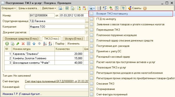 В этом случае табличная часть документа «Возврат ТМЗ поставщику» будет заполнена данными документа «Поступление ТМЗ и услуг». После чего можно будет скорректировать номенклатурные позиции и количество возвращаемого товара.