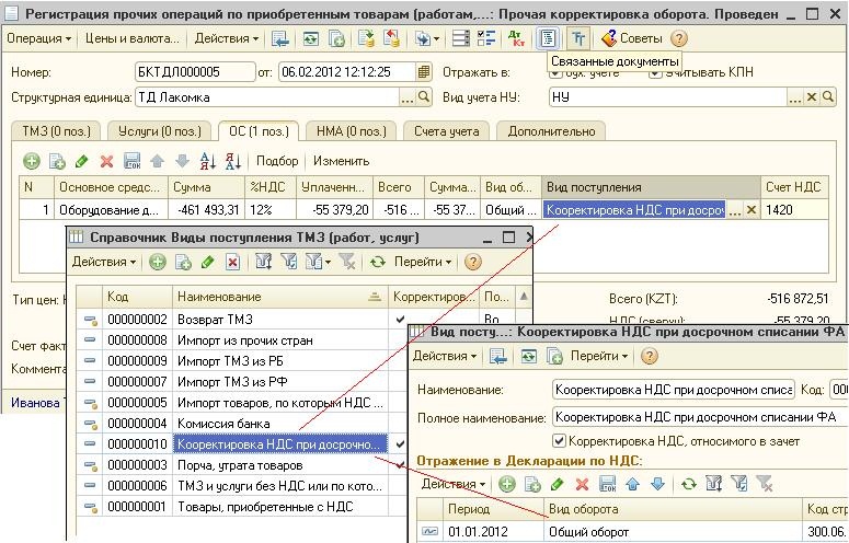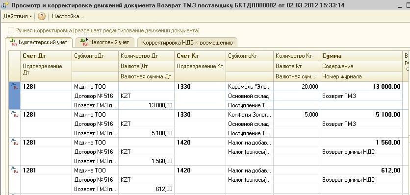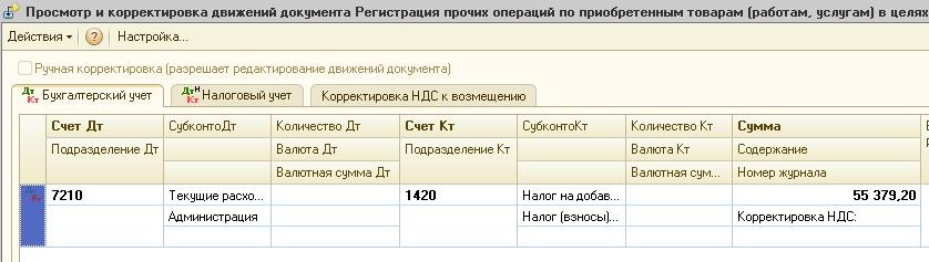 Также сформируется записи в регистр накопления «Корректировка НДС», что позволит отразиться данной сумме в Приложении 300.06 формы 300.00 «Декларация по Налогу на добавленную стоимость».
