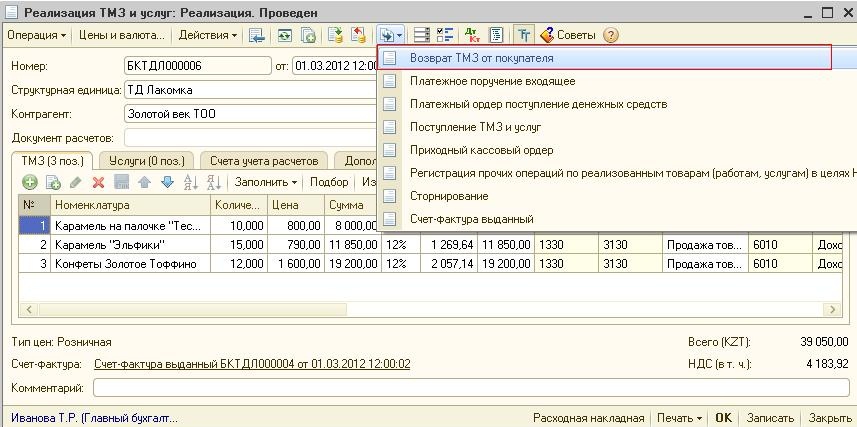 При формировании документа «Возврат ТМЗ от покупателя»табличная часть документа будет заполнена данными документа «Реализация ТМЗ и услуг». Данные табличной части можно откорректировать вручную по номенклатурным позициям и количеству возвращаемого товара.