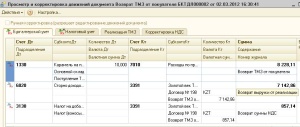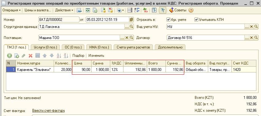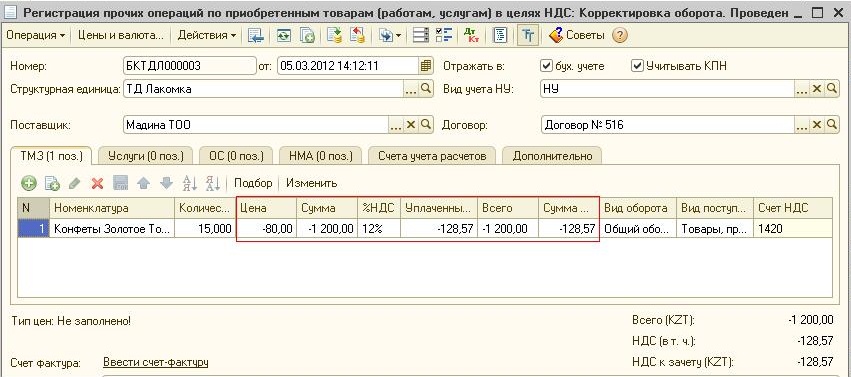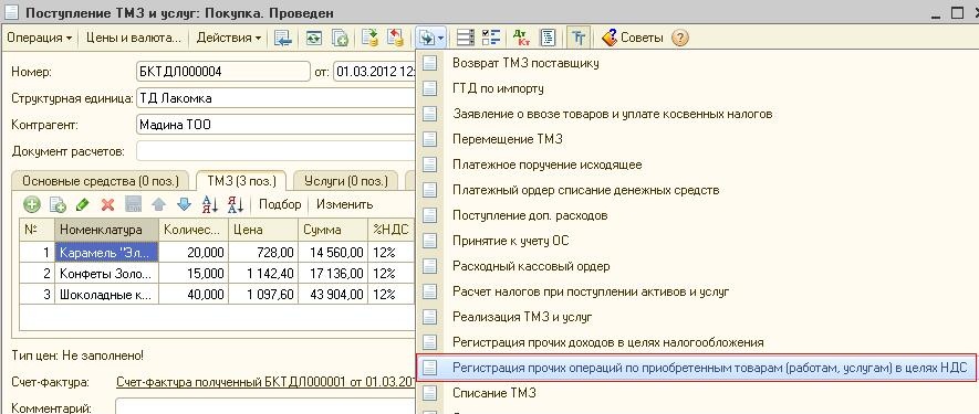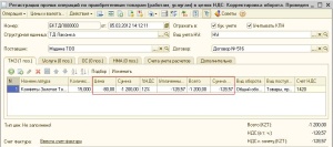 В этом случае табличная часть документа «Регистрация прочих операций по приобретенным товарам (работам, услугам) в целях НДС» заполнится данными документа «Поступление ТМЗ и услуг» и будет легче откорректировать табличную часть по номенклатурным позициям и стоимости.