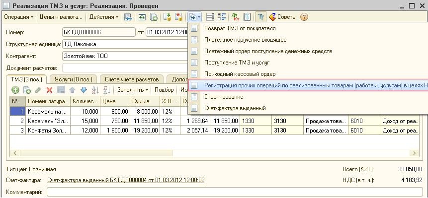 В этом случае табличная часть документа «Регистрация прочих операций по реализованным товарам (работам, услугам) в целях НДС» будет заполнена данными документа-основания. Документ имеет два вида операции: