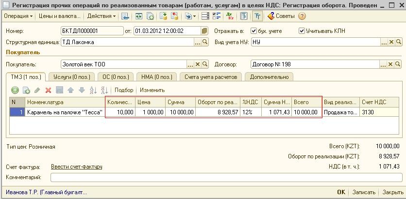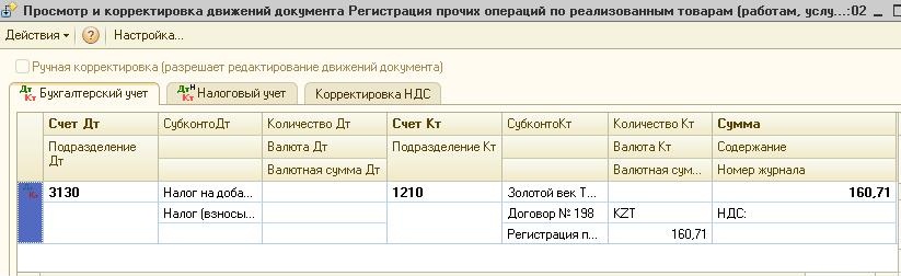 При проведении документа сформируются записи в регистр накопления «Налог на добавленную стоимость» и проводки по увеличению НДС начисленного.