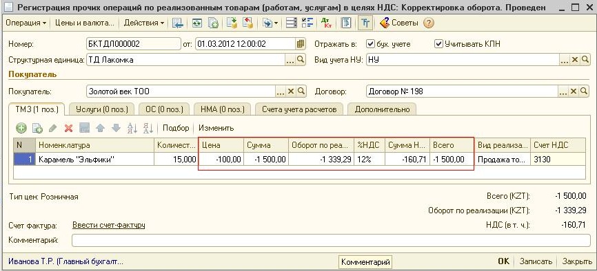 При проведении документа сформируются проводки по корректировке НДС начисленного.
