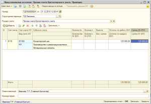 В качестве документа партии при вводе начальных остатков в данном случае создается документ «Партия (ручной учет)», который является вспомогательным и не делает никаких проводок.