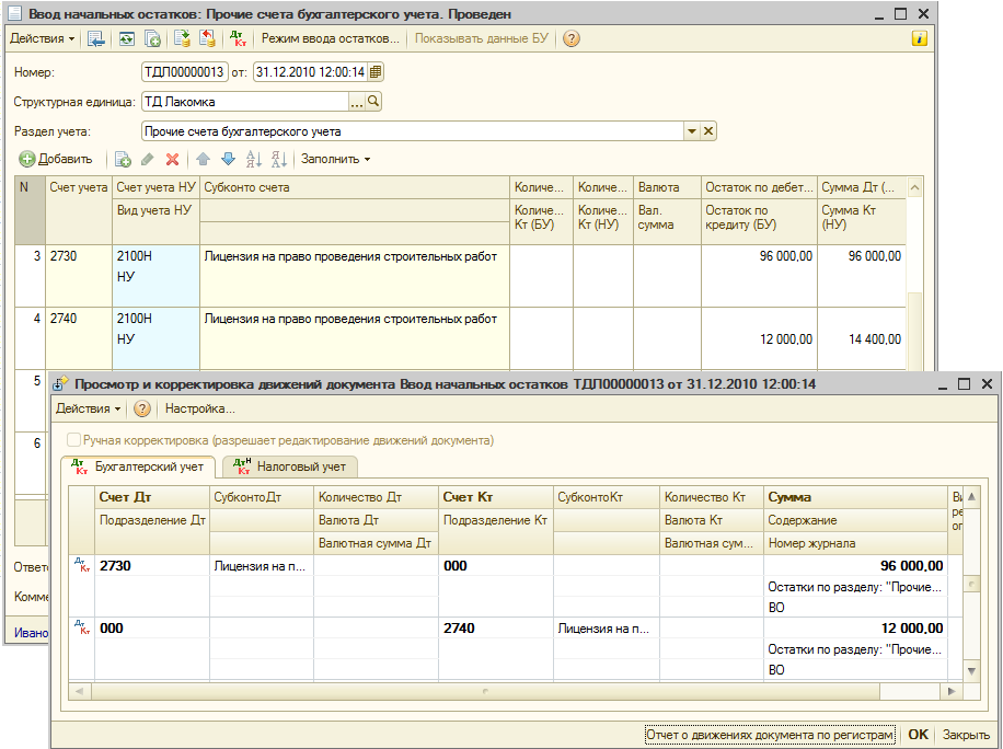 Первый документ «Движение незавершенного производства» выполнит проводки по переносу сумм НЗП со счетов производственного учета на счета учета незавершенного производства на дату ввода начальных остатков.