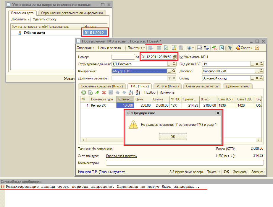 При попытке проведения документа (нового или существующего не проведенного) в периоде до даты запрета, пользователю выводится сообщение «Редактирование данных этого периода запрещено. Изменения не могут быть записаны...».
