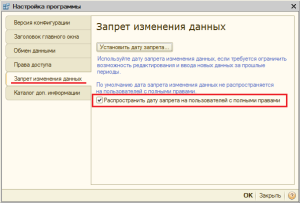 По умолчанию, ограничение по дате запрета не распространяется на пользователей, которым доступна роль «Полные права». Для того, чтобы дата запрета изменения данных распространялась на пользователей с ролью «Полные права», необходимо установить признак «Распространить дату запрета на пользователей с полными правами» на закладке «Запрет изменения данных» в «Настройках программы» (меню «Предприятие» - «Настройка параметров учета» - «Настройка программы»).