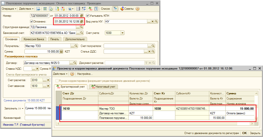 При проведении документов (например, «Поступление ТМЗ и услуг», «Реализация ТМЗ и услуг», платежные документы на оплату поставщикам и на поступление оплаты от покупателей), которые осуществляют движение по счетам учета, осуществляется контроль состояния взаиморасчетов. То есть в зависимости от оформляемого документа, программа анализирует наличие авансов или задолженности и производит либо зачет аванса, либо погашение задолженности в автоматическом режиме. Выполнение анализа состояния по взаиморасчетам также может занимать продолжительное время и увеличивать время проведения документов. При установке даты актуальности учета отключается механизм автоматического контроля состояния взаиморасчетов. При этом в движениях документа отсутствуют проводки по зачету авансов или по погашению задолженности. Например, 01.08.2012 года был оформлен документ «Платежное поручение исходящее» с видом операции «Оплата поставщику» на перечисление аванса. При проведении данного документа будут сформированы проводки по отражению аванса на счете 1610.