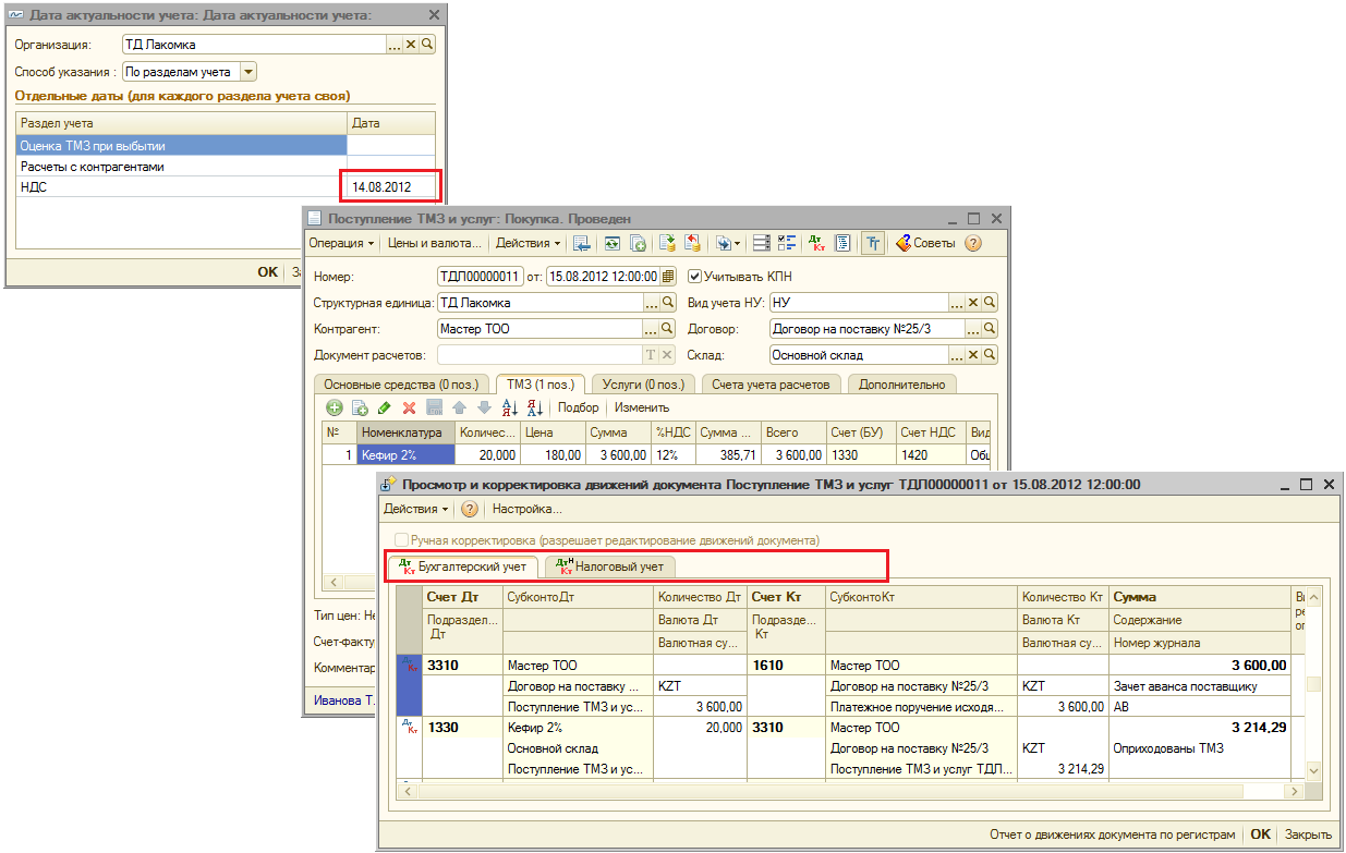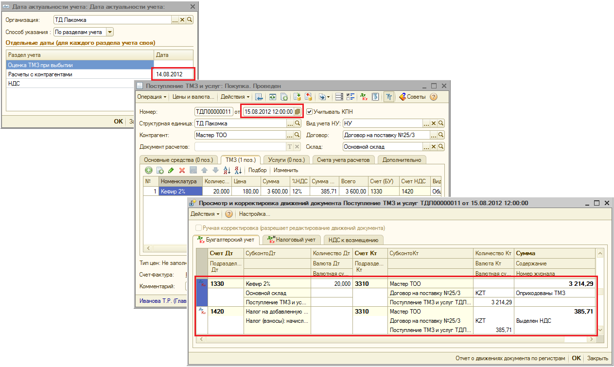 Затем, от 15.08.2012 года оформляется документ «Поступления ТМЗ и услуг» от контрагента ТОО Мастер. В том случае, если дата актуальности учета не установлена, тогда при проведении документа поступления будут сформированы проводки по зачету аванса.