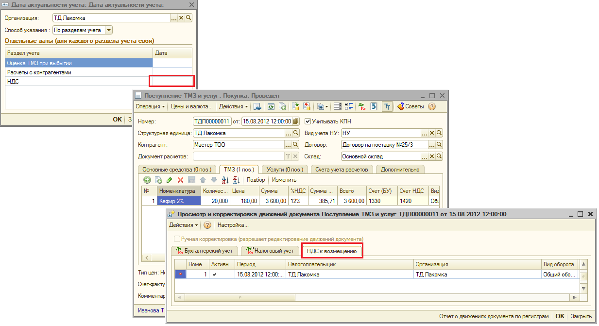 Если установить дату актуальности учета по разделу «НДС», тогда при проведении документа «Поступления ТМЗ и услуг» будут отсутствовать движения по регистру накопления «НДС к возмещению».
