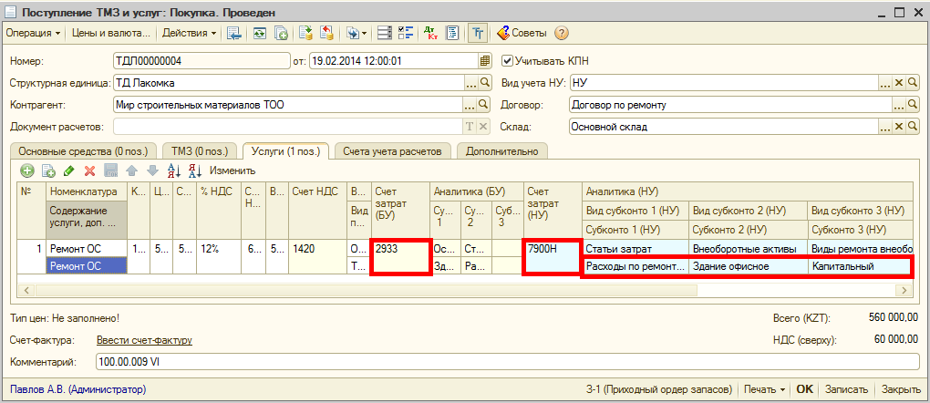 Пример отражения расходов по капитальному ремонту: организацией произведен капитальный ремонт Здания офисного на сумму 500 000 тг. приобретение услуг по ремонту оформлено документом Поступление ТМЗ и услуг. Затраты на ремонт в бухгалтерском учете отражаются по счету 2933, в налоговом учете указывается счет — 7900Н, вид ремонта — «капитальный». Статья затрат, указанная в документе, ссылается на код строки 100.00.009 IIIH.
