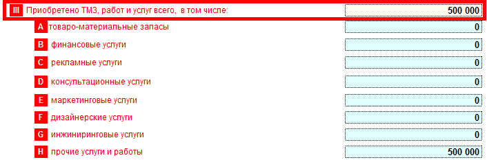 Пример: в отчетном периоде организацией приобретены ТМЗ на сумму 10 000 тг. Данные ТМЗ использованы в строительстве собственного здания. Стоимость приобретенных ТМЗ отразится по строке 100.00.009IIIA, отнесение стоимости ТМЗ на строительство отразится по строке 100.00.009VII. Таким образом, в строке 100.00.009 вычет по ТМЗ, использованным в строительстве не образуется.