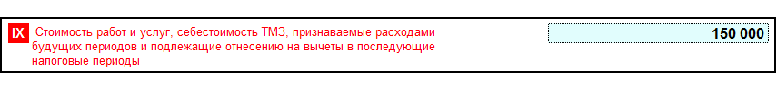 В строку 100.00.009.IX включаются корреспонденции счетов налогового учета с видом учета НУ по счету 1620Н «Расходы будущих периодов». При этом выбирается сальдо конечное по дебету с заполненной аналитикой, ссылающейся на справочник Расходы будущих периодов со статьей затрат, ссылающейся на подстроки 100.00.009.III.