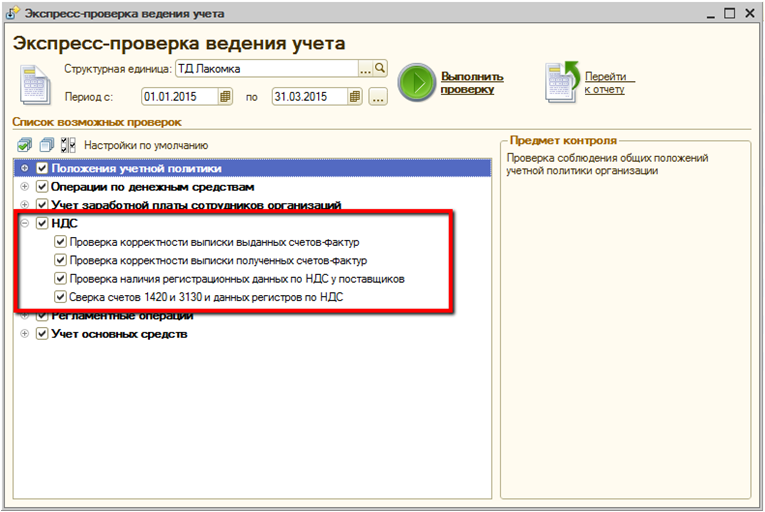 Перед началом составления Декларации по НДС можно выполнить проверку корректности учетных данных при помощи обработки «Экспресс-проверка ведения учета» по подсистеме «НДС».