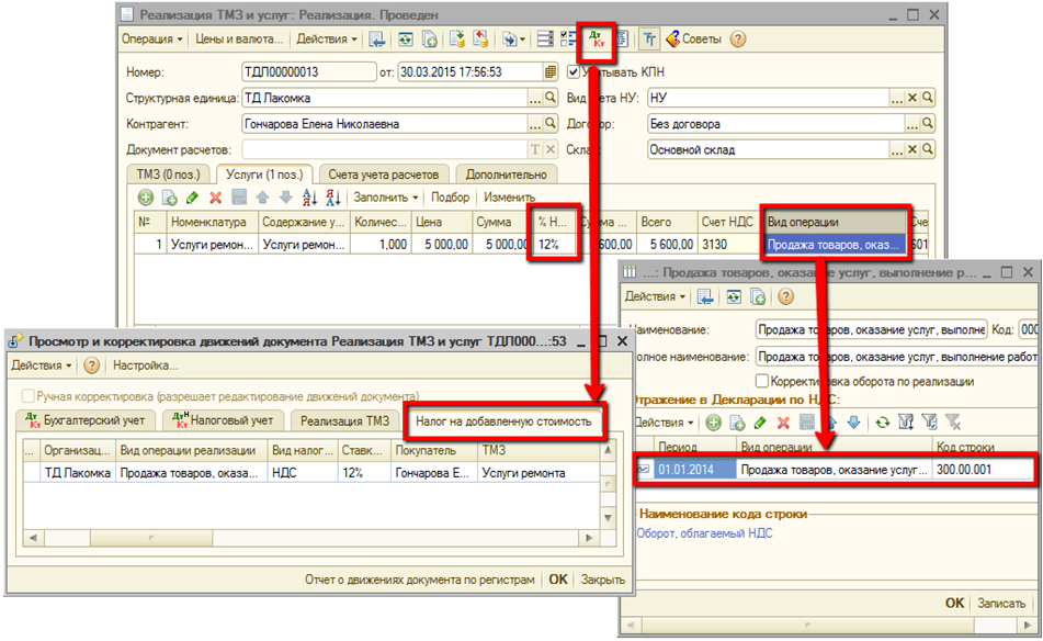На заполнение раздела оказывают влияние указанные в документах «Ставка НДС» и «Вид операции». При проведении документов, отражающих реализацию, данные отражаются в регистре накопления «Налог на добавленную стоимость».