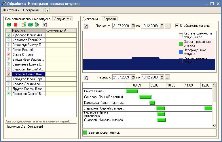 С помощью инструмента «Запланированные кадровые перестановки» можно автоматически создать документы перемещения, возврата на работу из командировки или отпуска. Инструмент анализа отпусков позволяет организовать процесс разработки графиков отпусков для большого числа работников, визуально увидеть распределение отпусков по времени, определить имеет ли работник право на запланированный отпуск и не противоречит ли период отпуска намеченным событиям.