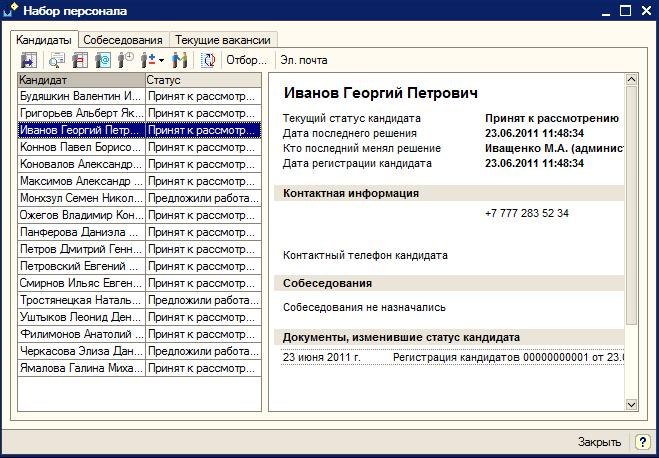 Для работы с кандидатами в рамках конфигурации предназначены следующие инструменты: