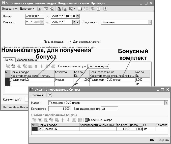 Таким образом, бонусным комплектом является – новая позиция в справочнике «Номенклатура» - «Телевизор + DVD плеер».