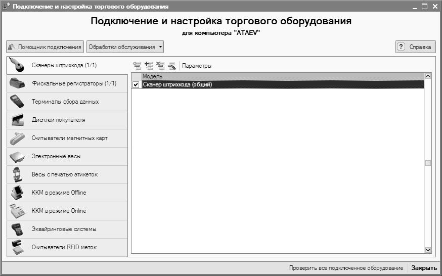 В последующем для проверки и настройки уже подключенного торгового оборудования можно воспользоваться обработкой «Подключение и настройка торгового оборудования». Для запуска обработки нужно открыть пункт меню «Подключение и настройка торгового оборудования» («Сервис – Торговое оборудование»).
