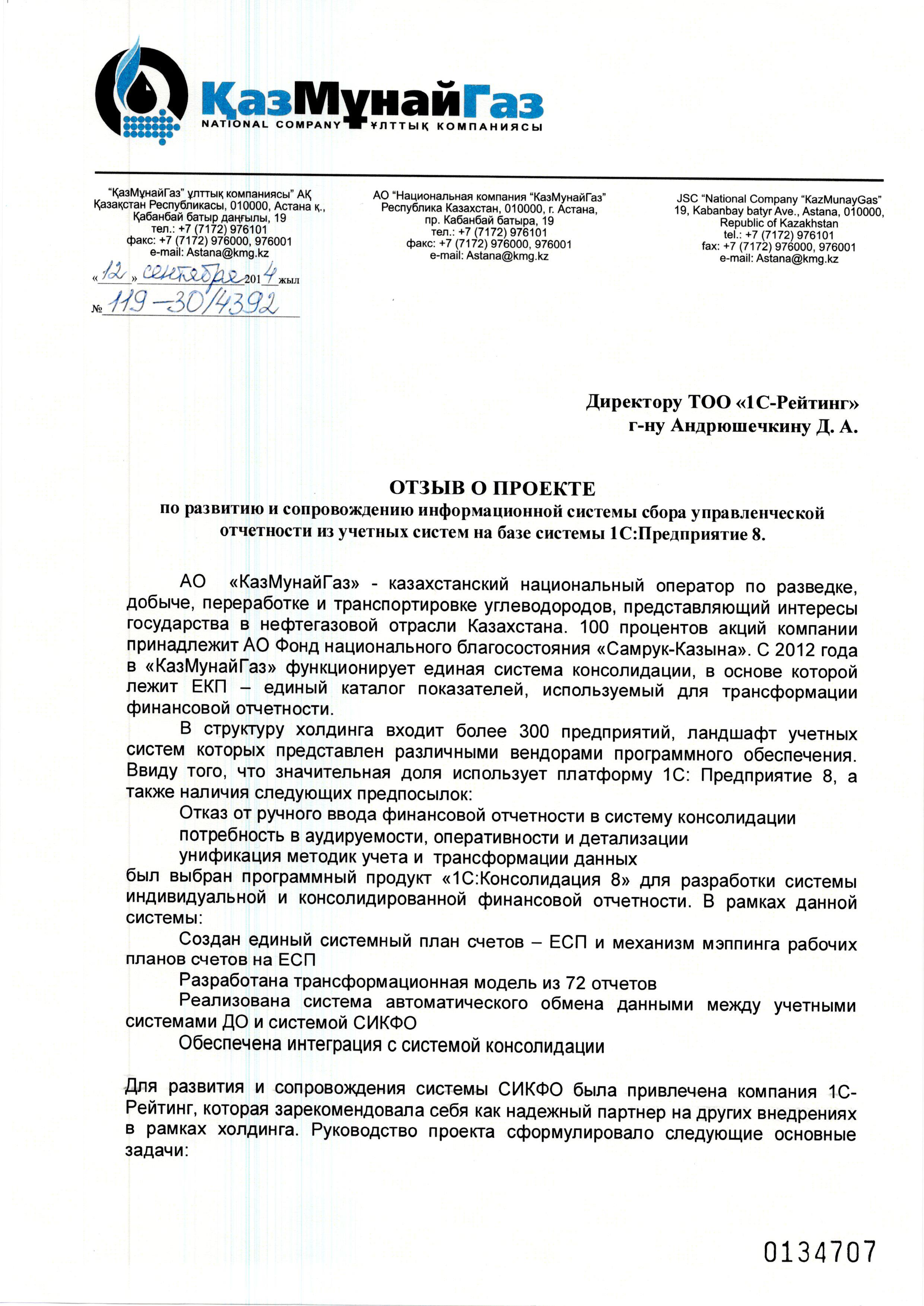 Компания «1С-Рейтинг» внесла свой вклад в развитие и сопровождение системы консолидации в АО НК «КазМунайГаз». Созданная информационная система позволила компании усилить финансовый контроль и прозрачность данных дочерних организаций, за счет повышения уровня автозаполнения финансовой отчетности. На сегодняшний день количество пользователей системы составляет 200 человек.