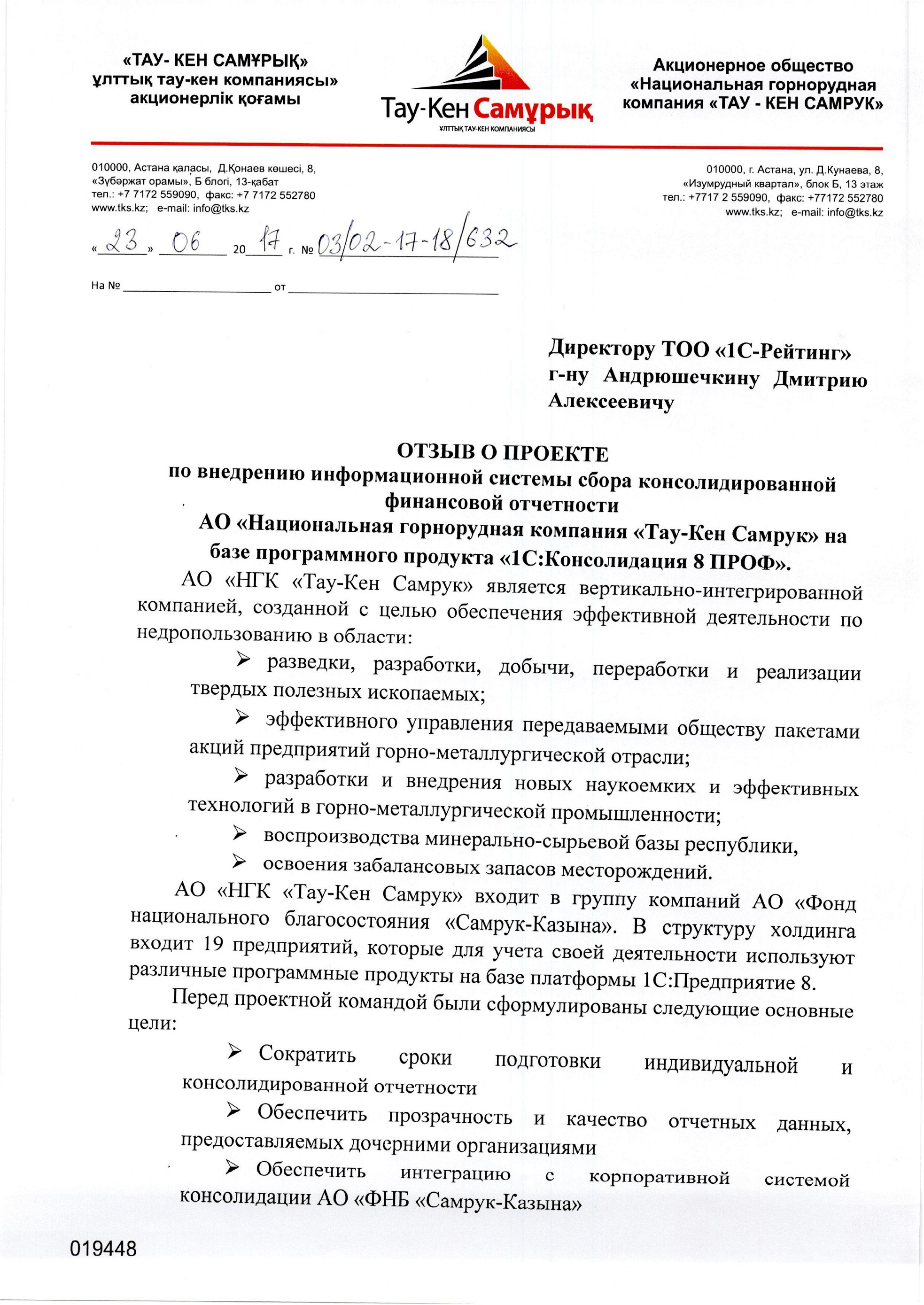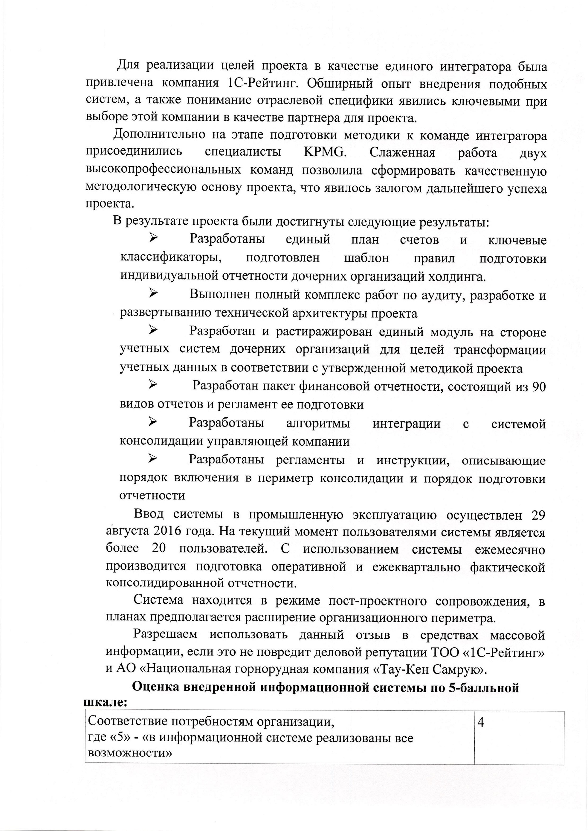 Завершен проект внедрения информационной системы сбора консолидированной финансовой отчетности АО «Национальная горнорудная компания «Тау-Кен Самрук» на базе программного продукта «1С:Консолидация 8 ПРОФ».