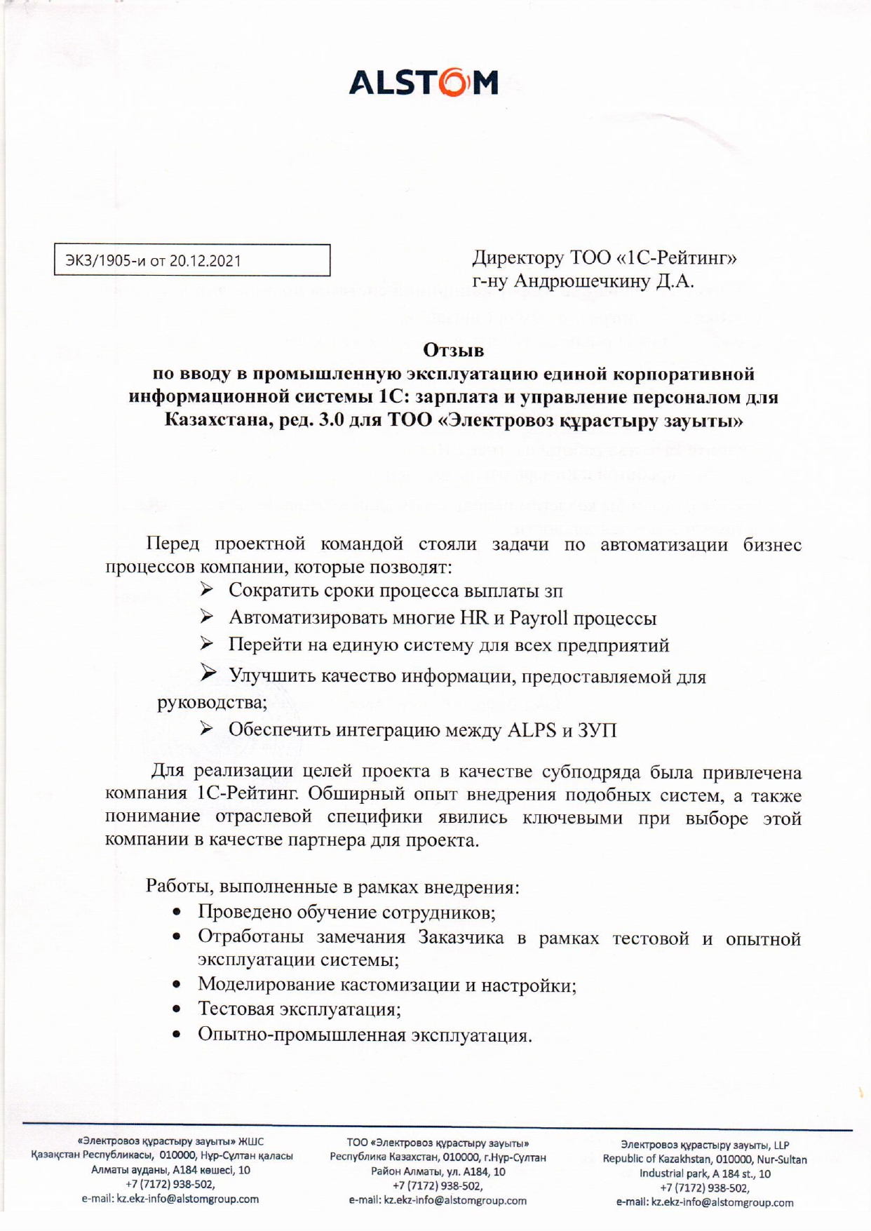 Внедрение проекта для ТОО «Электровоз құрастыру зауыты» охватили работы в системе: