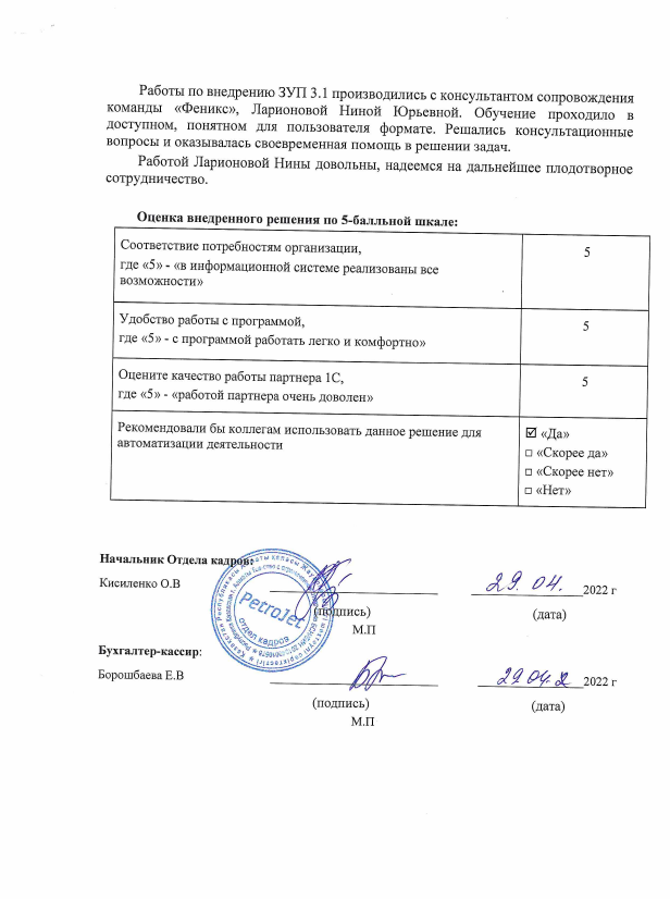 Компания вела учет кадров и заработной платы в «1С-Рейтинг: Нефтебаза. Функциональные возможности данного отраслевого решения не покрывали индивидуальные особенности ведения учета компании. Было принято решение внедрить расширенный учет заработной платы и кадров через конфигурацию «1С:Предприятие 8. Зарплата и Управление Персоналом для Казахстана» 3.1 (далее ЗУП 3.1) Выполнены следующие работы: