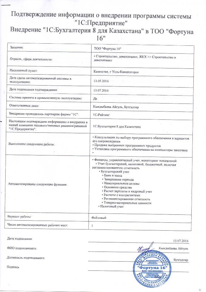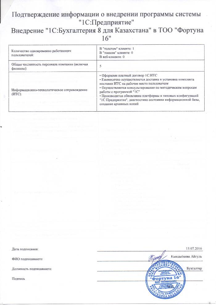 | Внедренное типовое решение: | 1С:Бухгалтерия 8 для Казахстана |